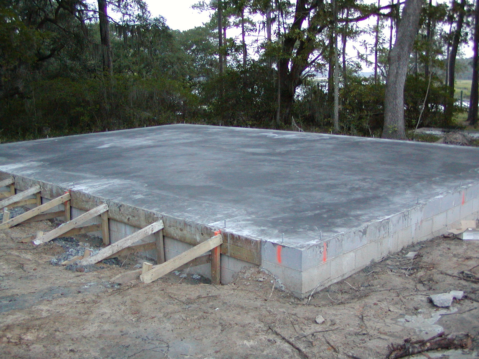October 10, 2007 -- The garage slab has been poured. Just as on the house, the orange lines show where the steel anchor bolts are installed. The front (lower left in the photo) has been formed since that is the entrance and is slightly lower than the walls. |