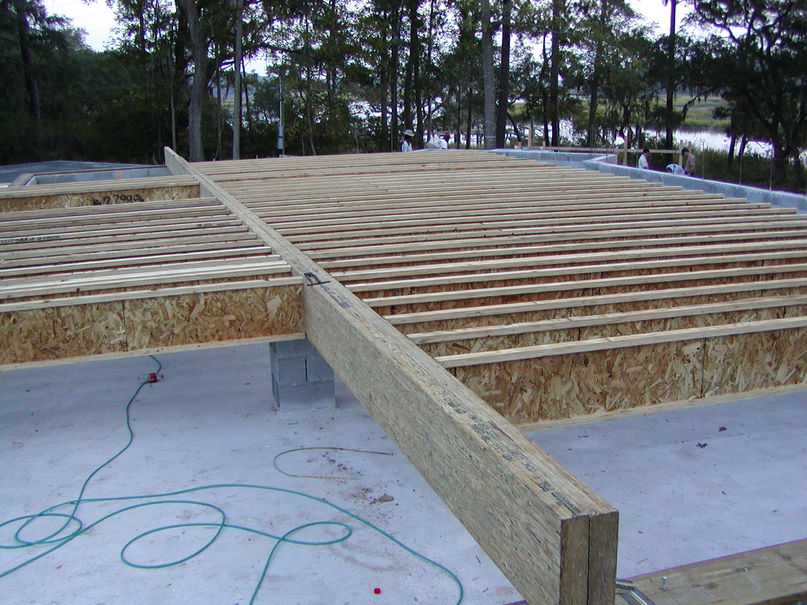 October 10, 2007 -- The floor trusses are being installed. Note the massive beam down the center of the house. Trusses should be complete today. The installation of the 3/4" tongue & groove water resistant plywood should begin today. |