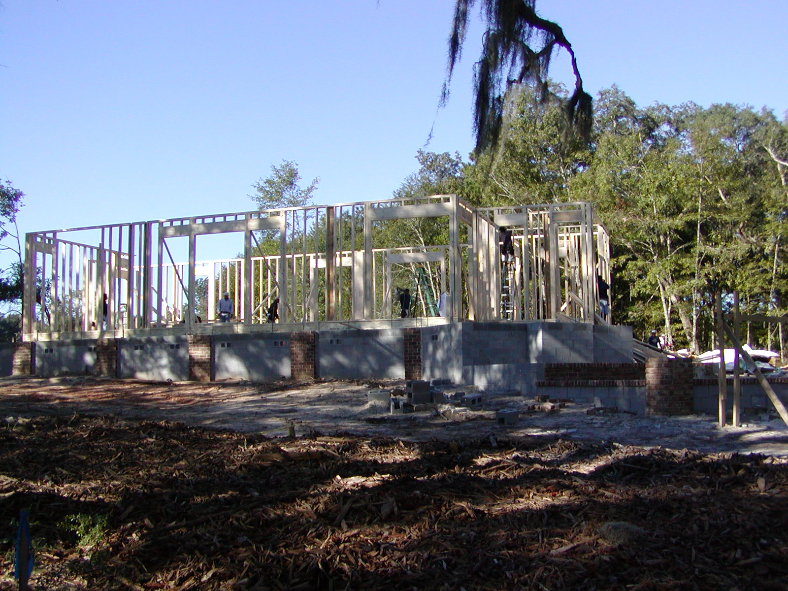 October 12, 2007 -- This is the front of the house. The brick column on the right will support one of the posts of the pergola. Look at the wall heights compared to the workers. | ![]() |