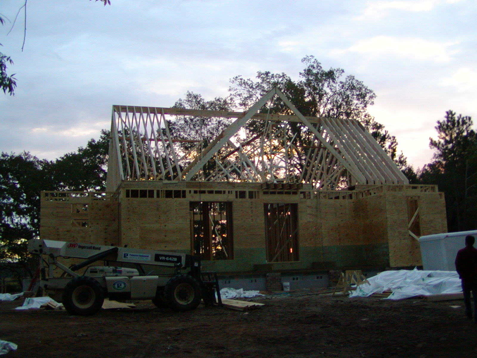 October 19, 2007 -- The rear (driveway side) of the house is also taking shape. The garage is on the left. The red glow in the background is the early morning sun. | ![]() |