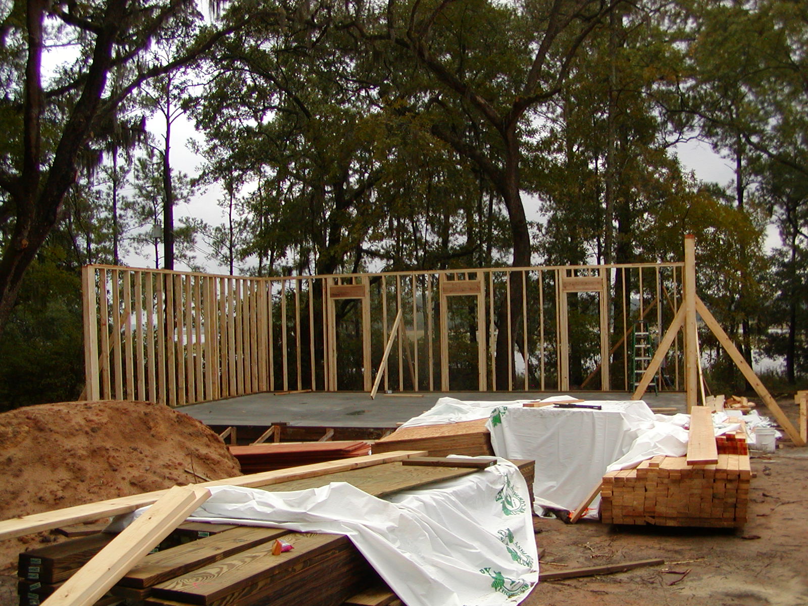 October 24, 2007 -- The garage walls are being framed. It will have three garage doors on the front. The openings on the back (far side) will be windows. | ![]() |