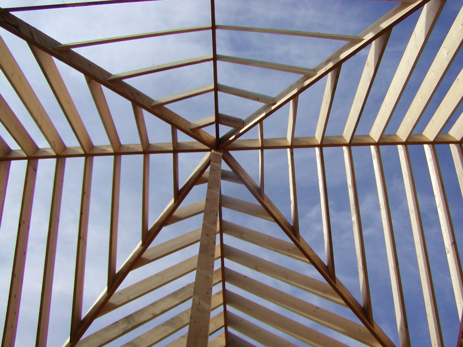 October 29, 2007 -- This is not a spider web. It is a view looking up at the roof framing. Gables run in four directions. | ![]() |