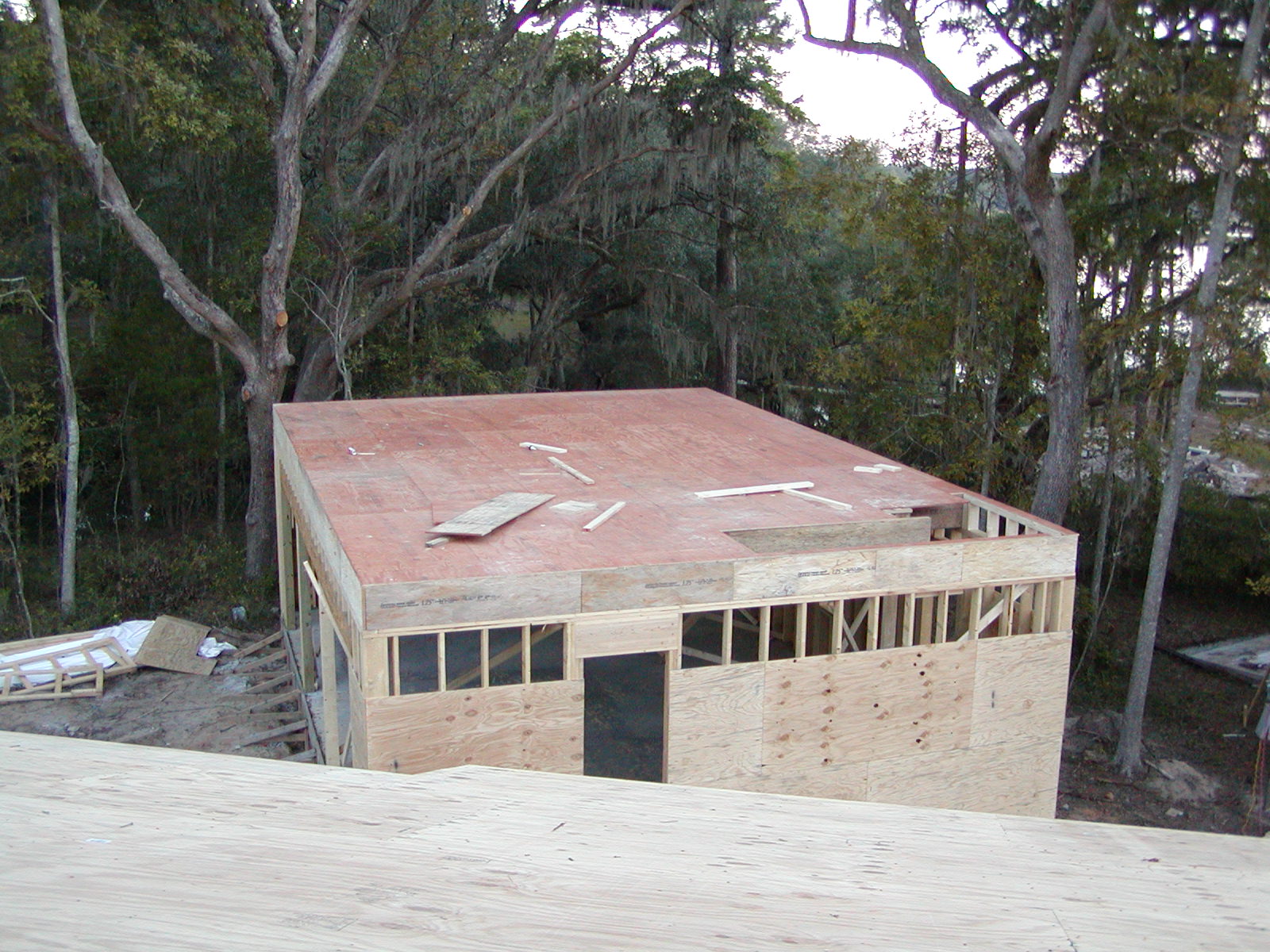November 3, 2007 -- The garage second floor has its subfloor down now. Since this is for storage, this is the only floor it will get (for now). The "L" shaped opening on the lower right side is for the stairwell. |