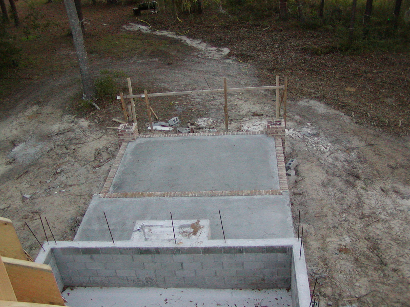 November 3, 2007 -- The floors for the pergola and outdoor kitchen are poured. The outdoor kitchen (just past the fireplace foundation) will have a wall built on each side. The fireplace will have a glass back so the fire will be visible from the outdoor kitchen. |