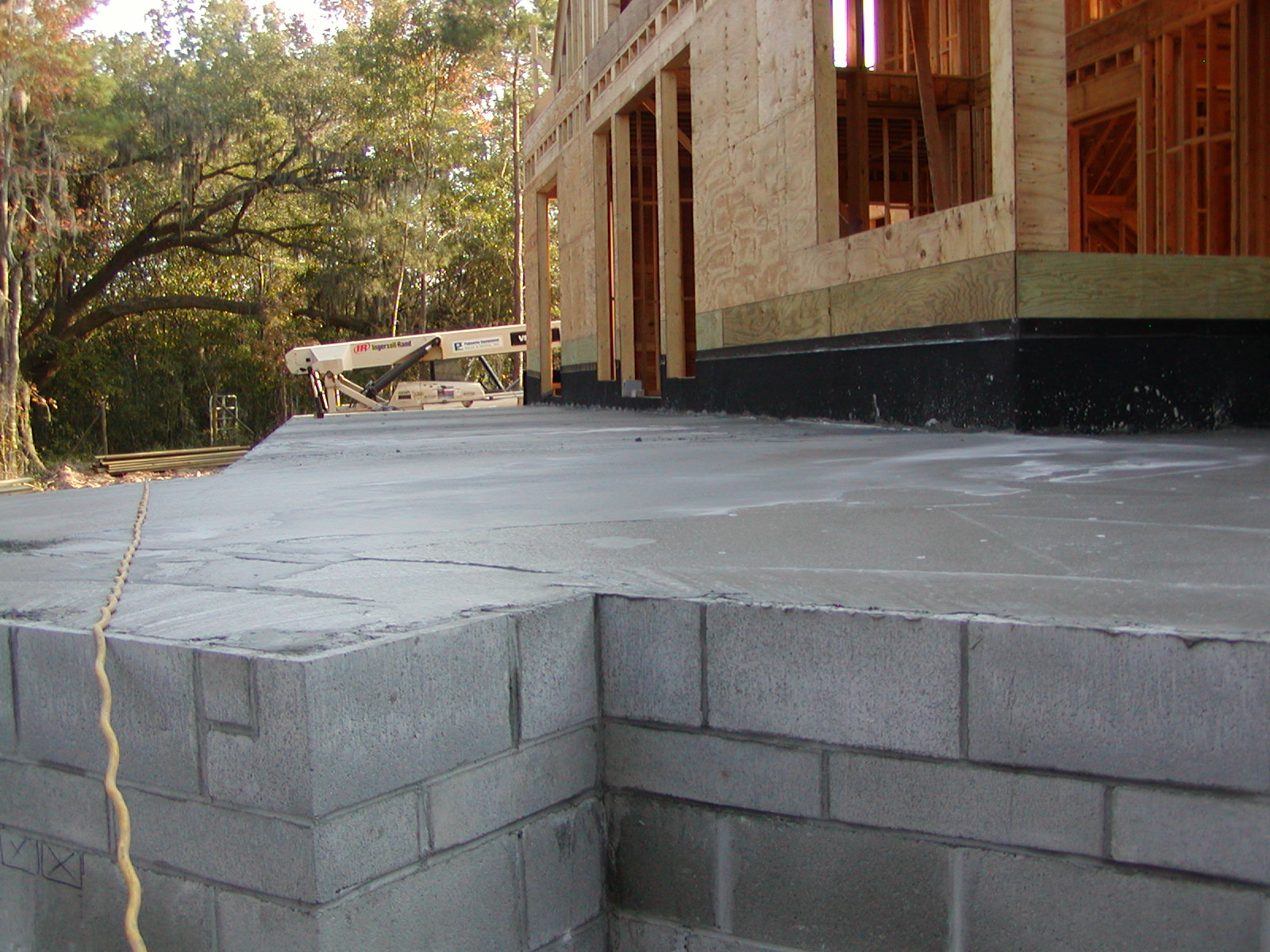 November 14, 2007 -- The front porch as seen from the outdoor kitchen. The area on the left is the fireplace foundation. Notice the treated plywood and water and ice shield next to the house to protect the house from moisture. |