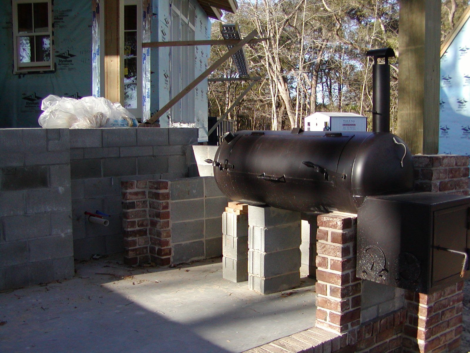 January 3, 2008 -- The outdoor kitchen is slowly coming together. A large smoker is already in place. Plumbing hookups for a sink can be seen towards the left side of the photo. | ![]() |