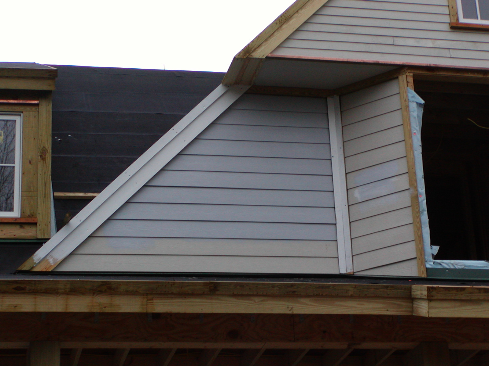January 30, 2008 -- A small section has a first coat of exterior trim color (white) and siding color (gray) for the customer's approval. The colors do not show up too well since today is very overcast. |