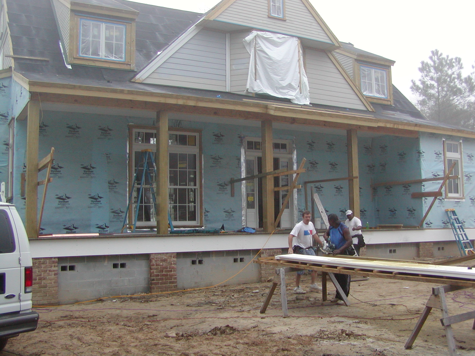 February 5, 2008 -- The skirt board (tall white board above the brick piers) and drip rail are being installed today. | ![]() |