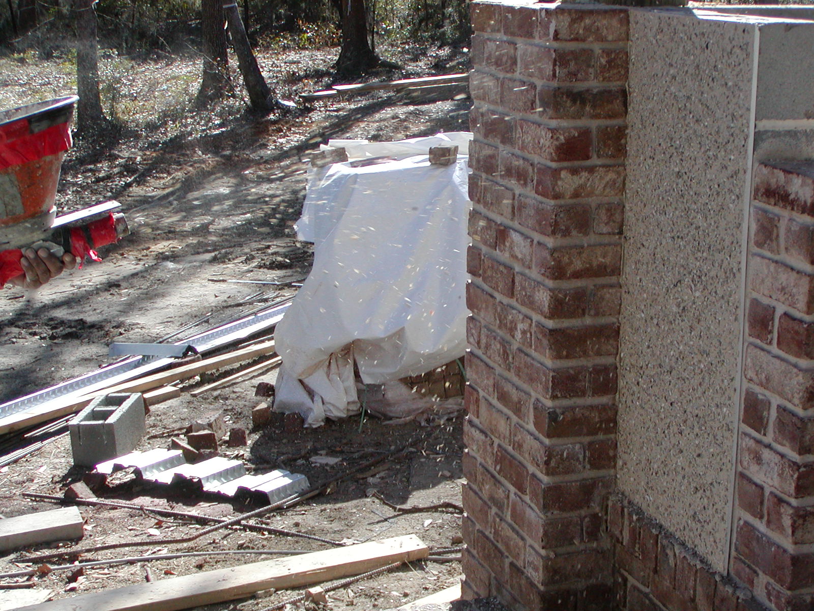February 7, 2008 -- Shells are being shot into the wet stucco. The red device on the left is the shell gun. You can see shell flying through the air towards the wet stucco. | ![]() |
