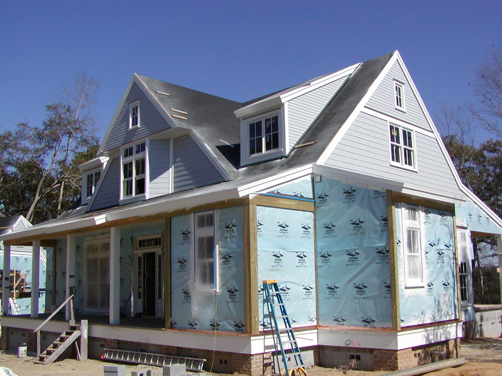 February 8, 2008 -- The house as viewed from the south west. The upper portion has final paint on the trim and siding. Two simulated columns have been added to the porch in the foreground. The copper drip rail is visible above the skirt board. |