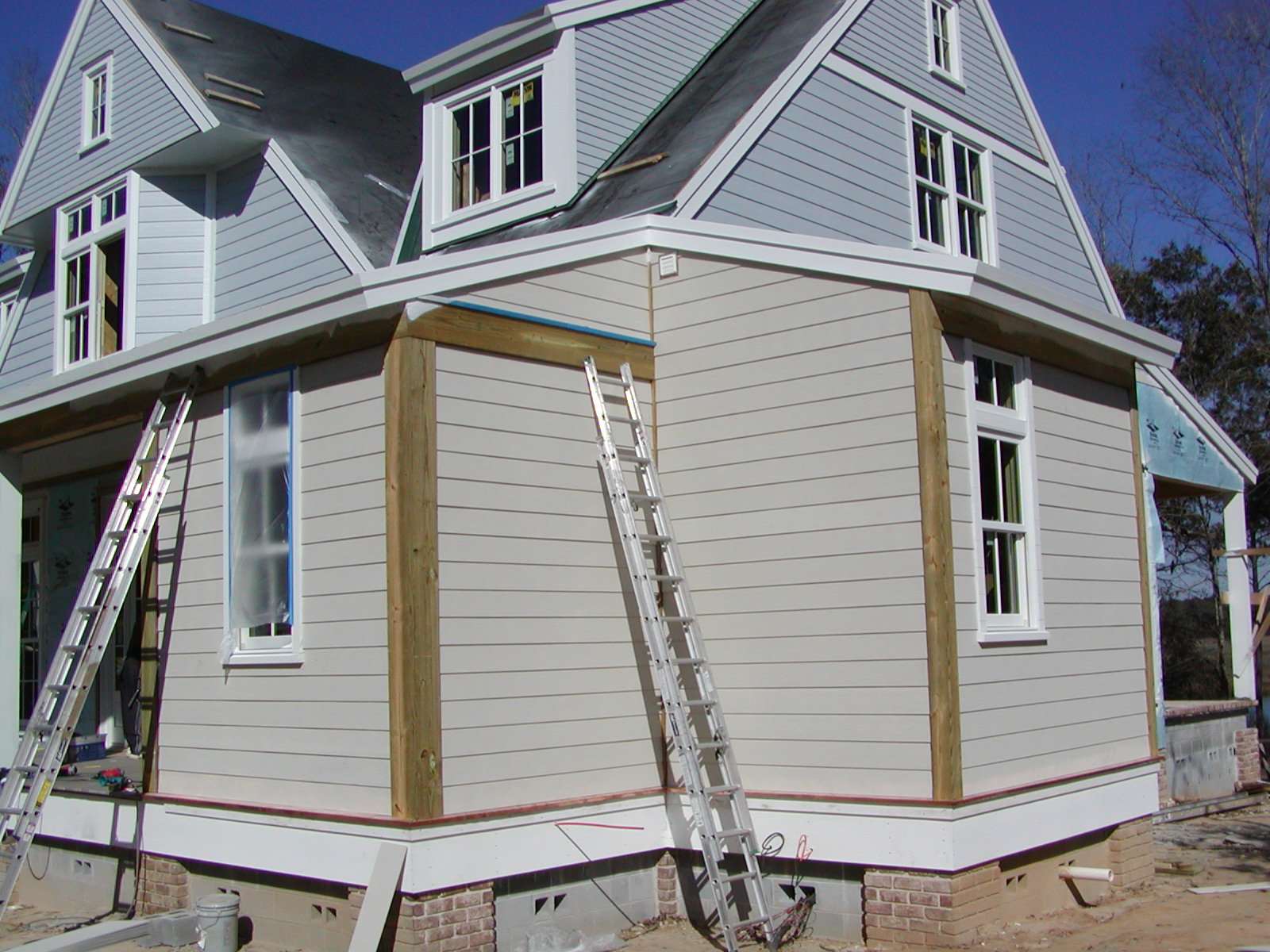 February 11, 2008 -- Siding has begun around the house below the roof line. If you look closely, you can see the green valley metal has been installed. Roofing will begin in earnest tomorrow, weather permitting. |