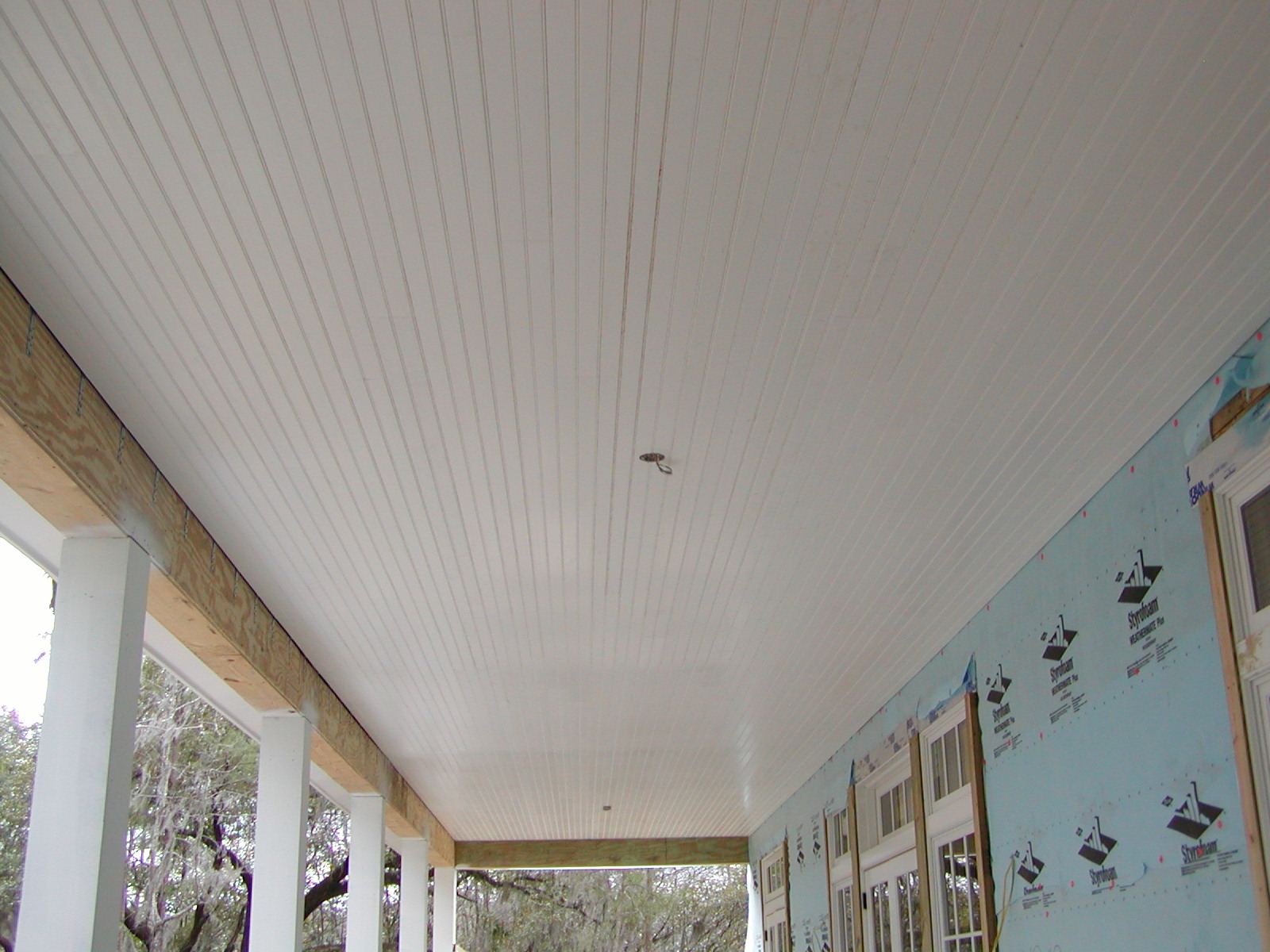 February 13, 2008 -- Part of the front (river side) porch ceiling is finished. It will have recessed can lights installed in it soon. The electrical boxes are for ceiling fans. | ![]() |