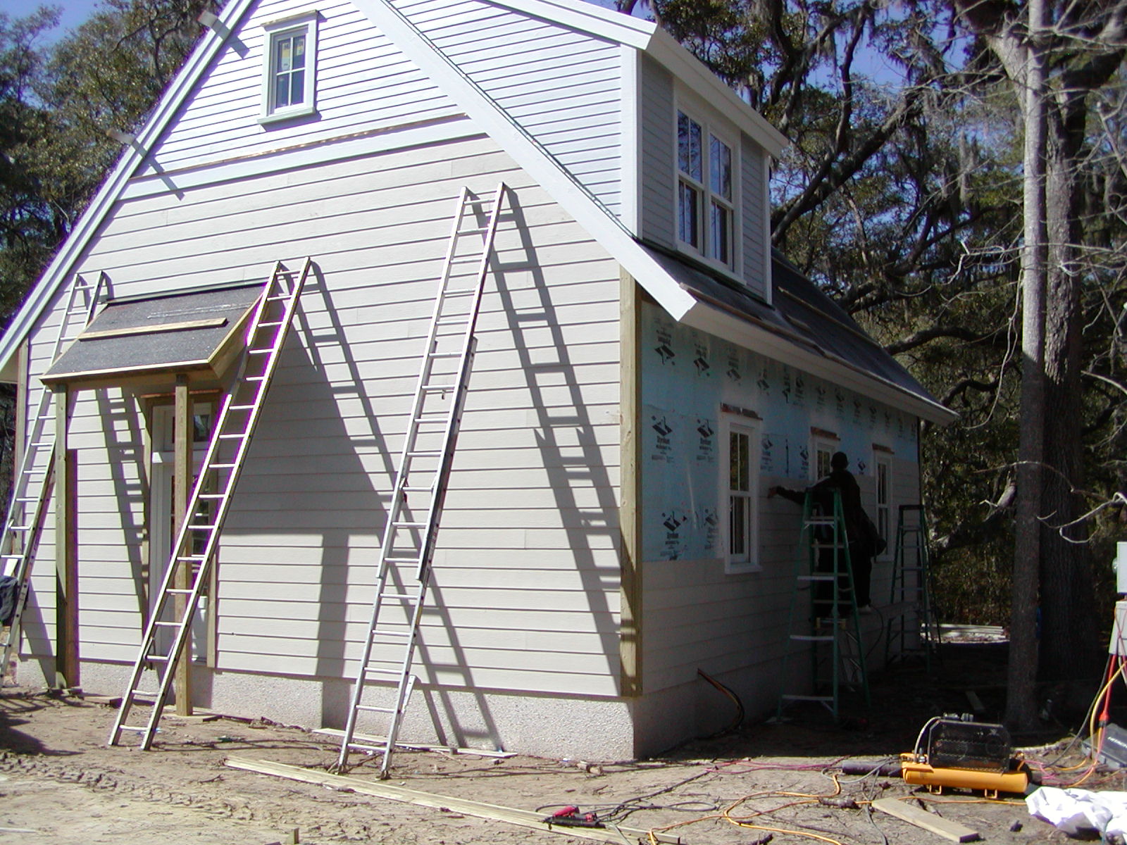 February 14, 2008 -- Siding is continuing around the garage. The supports under the roof over the door are temporary. | ![]() |