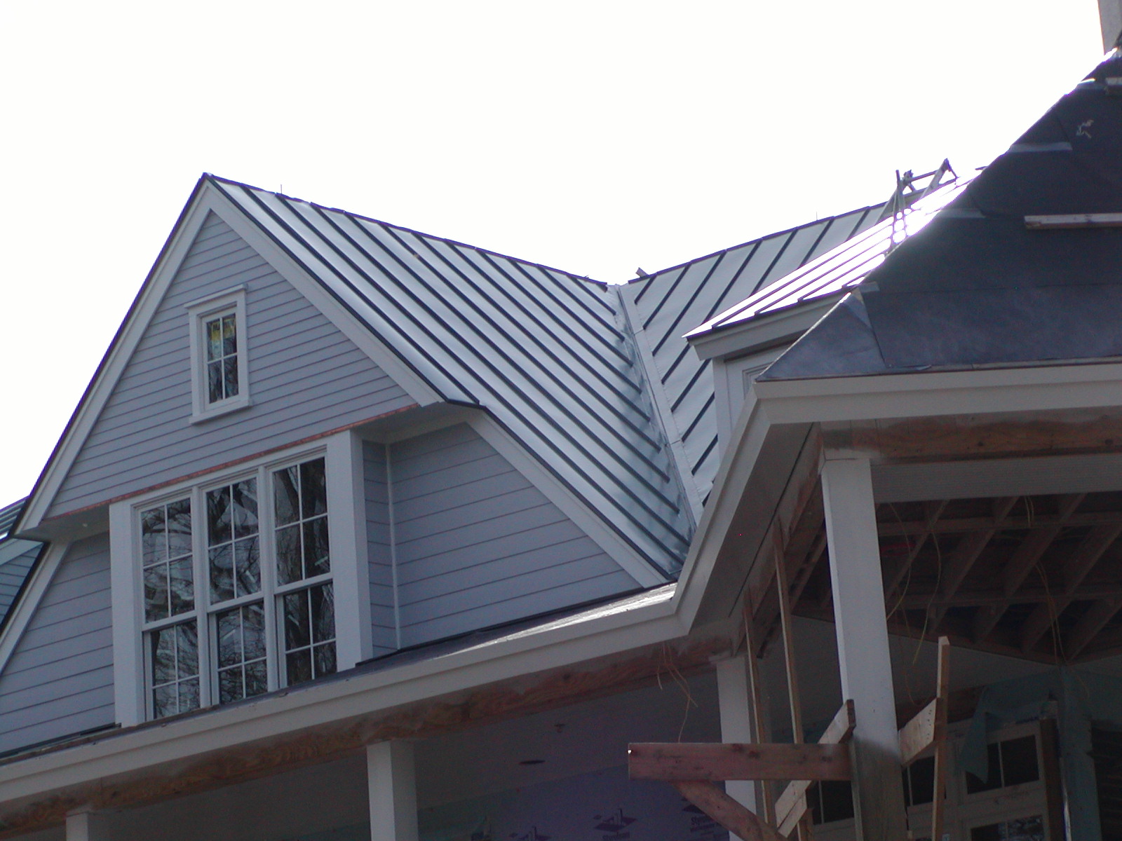February 15, 2008 -- The standing seam roof continues to be installed. A good bit of the front (river side) of the house is now roofed. | ![]() |