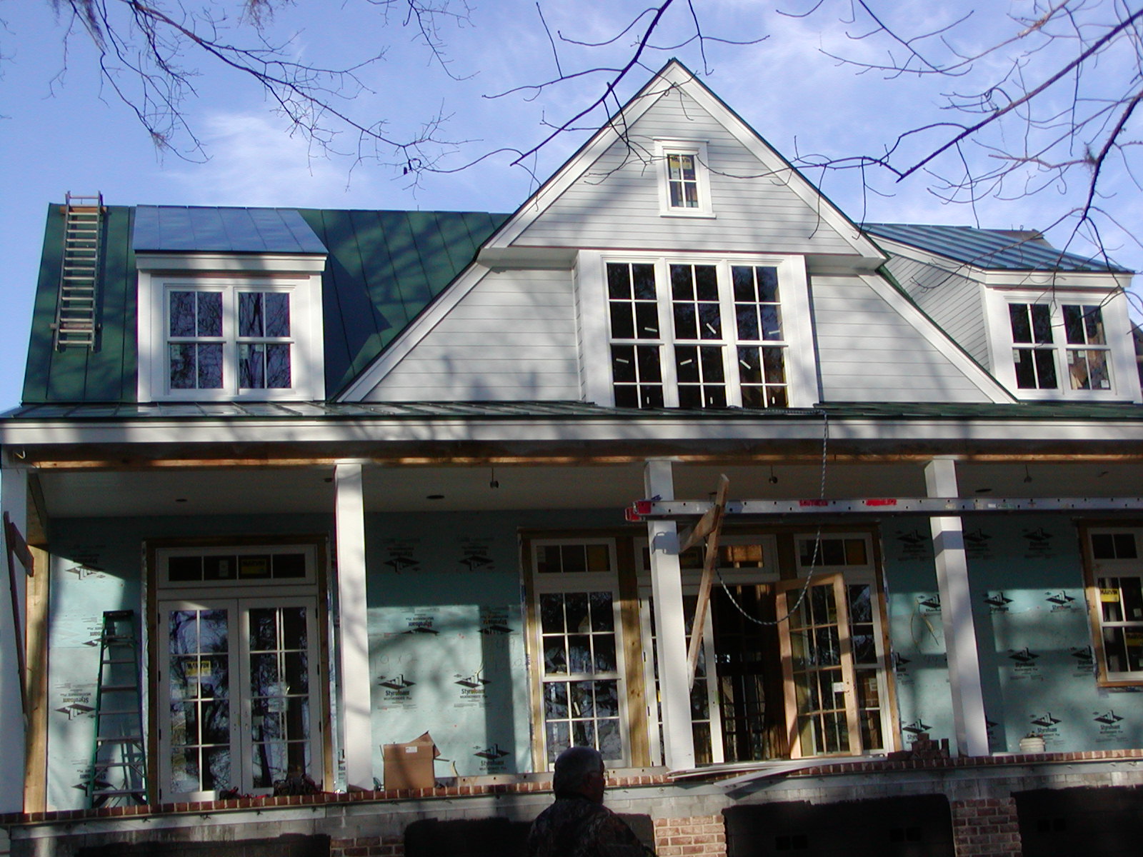 February 20, 2008 -- Much of the roof is installed on the front (river side) of the Weiss residence. Work is continuing on the roof. It should be completed in a week or so. | ![]() |
