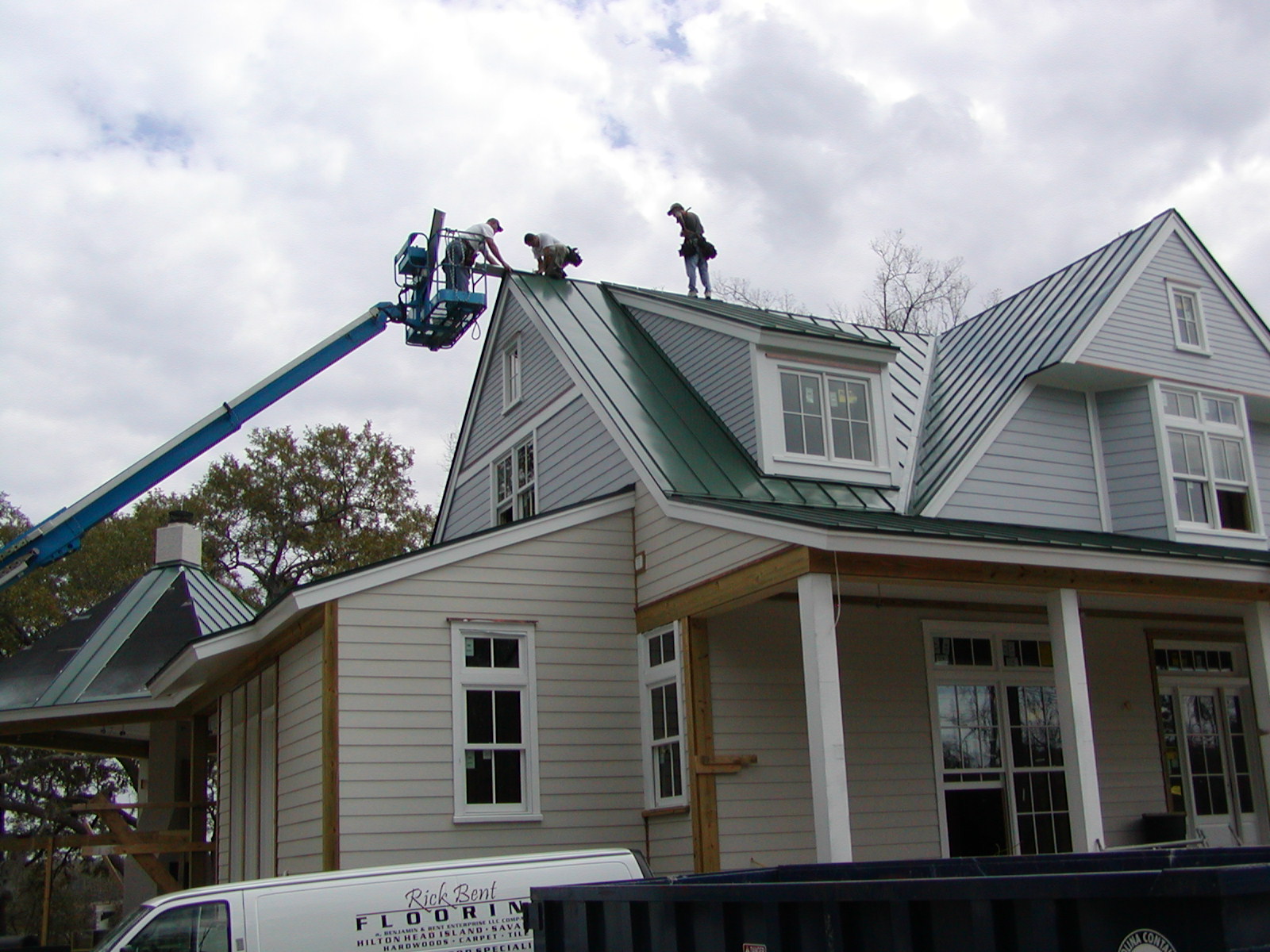 March 3, 2008 -- Work is beginning on the ridge cap for the house. Most of the house is now roofed. | ![]() |
