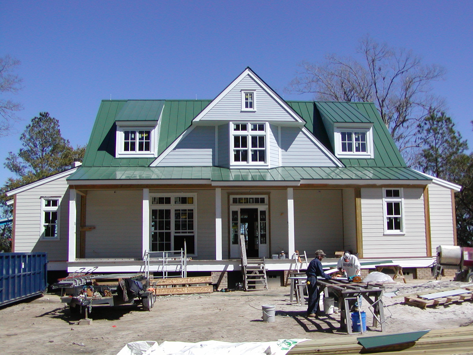 March 5, 2008 -- The roof is almost finished. Here on the driveway side, it appear complete. The small shed roof on the right needs to be finished as does the connector between the river side porch and the outdoor kitchen. |