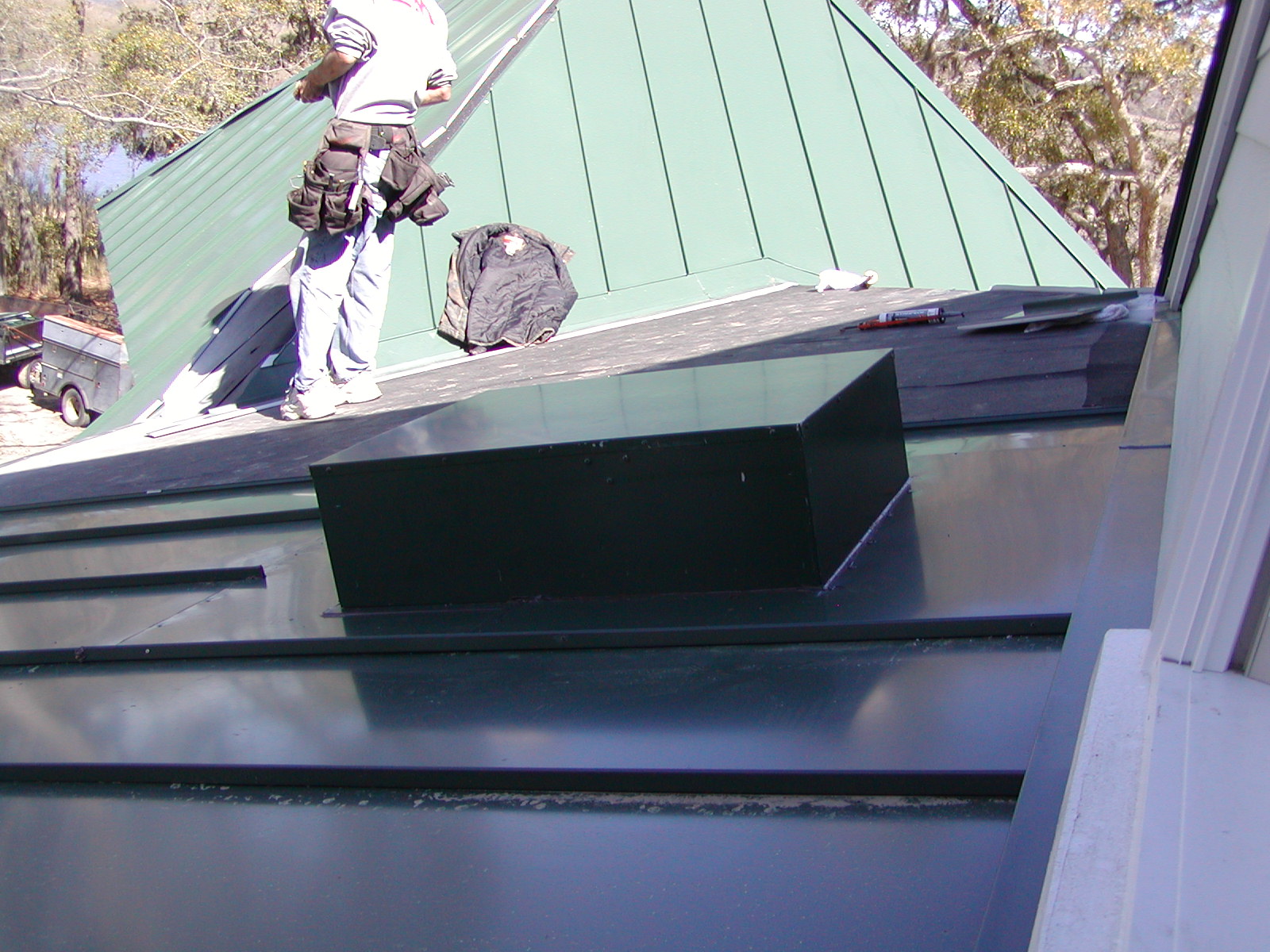 March 5, 2008 -- This box is a blower for the range hood. It has been painted to match the roof. In the distance, you can see where one of the last parts of the roof is being covered. | ![]() |