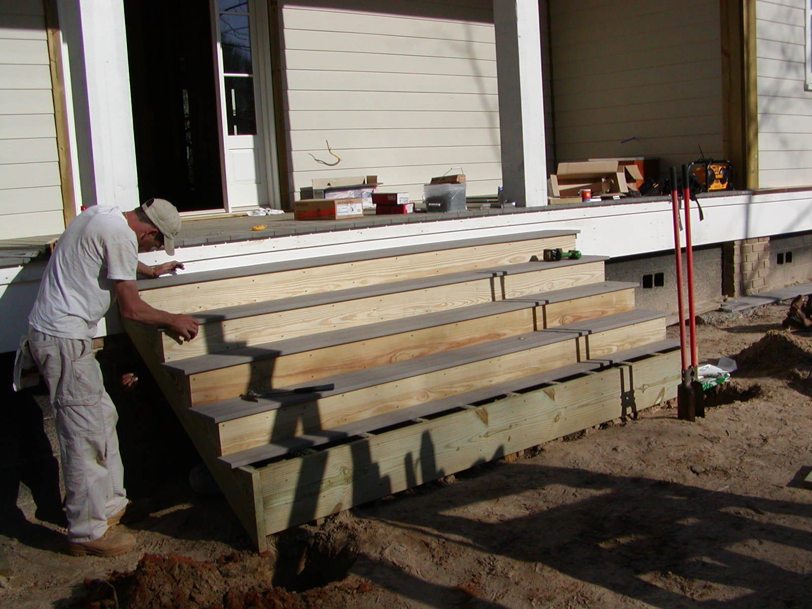 March 6, 2008 -- The rear porch (drive side) steps are being built. The treads are composite decking just as the porch deck is. | ![]() |