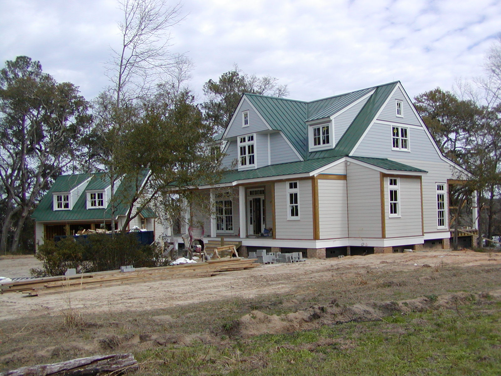 March 11, 2008 -- A view from the southwest shows the relationship of the house and garage. If you look closely, you can see the river just to the right of the front porch (the far side of the house). |