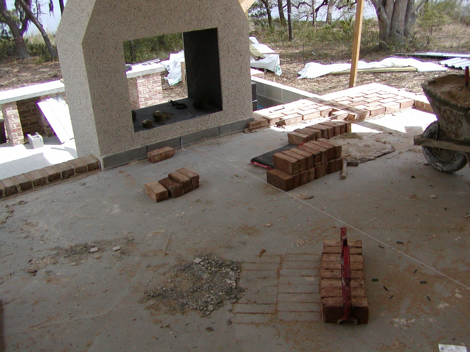 March 11, 2008 -- Work is continuing on the front porch. The last section is now being paved. A low hearth will be made of bricks in front of the fireplace. | ![]() |