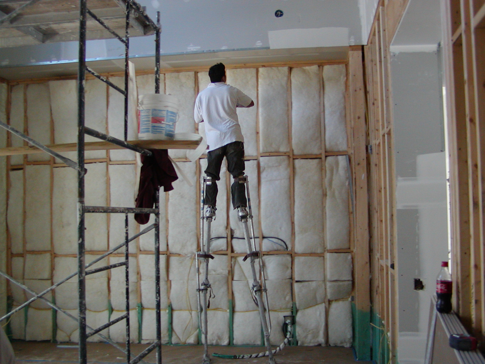 March 21, 2008 -- How do you finish sheet rock 12' from the floor? Wear stilts on stilts, of course. The worker has to climb on the scaffold to get on his double stilts. | ![]() |