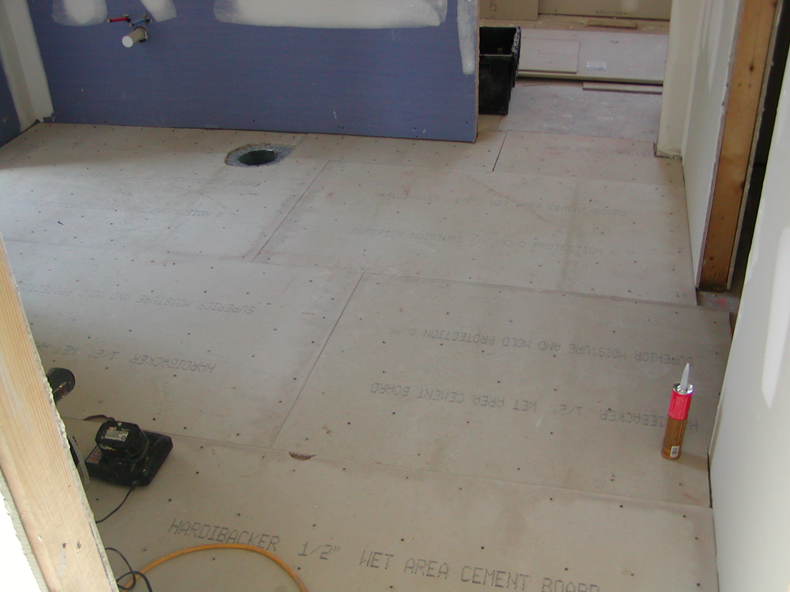 March 25, 2008 -- Backer board is installed in the master bathroom. It will have a floor heater installed and then floor tile. | ![]() |