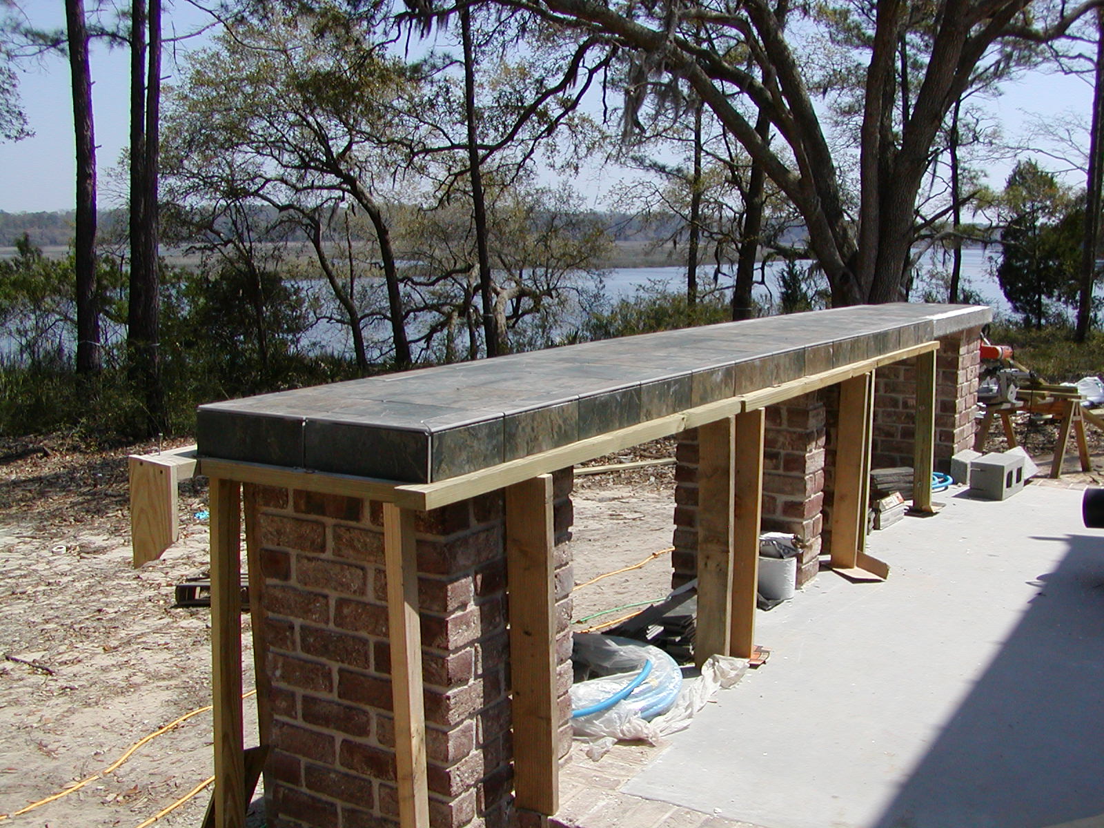 March 26, 2008 -- More tile is laid on the serving table. The temporary supports are to hold the tile until the thinset sets. This tile will have the same medium brown grout as the laundry room floor. |