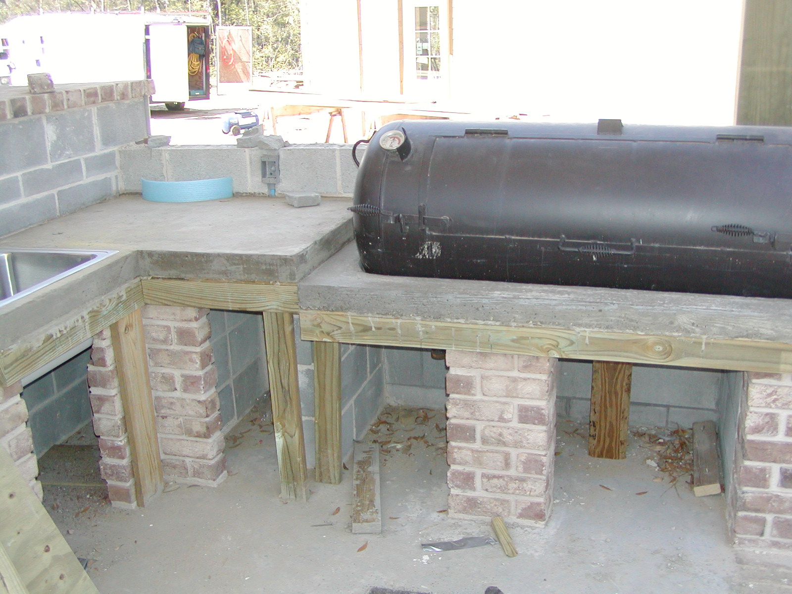 March 26, 2008 -- A counter top has been poured around the smoker. The boards showing are temporary form boards and will come off soon. These counter tops and walls will be tiled to match the serving table. |