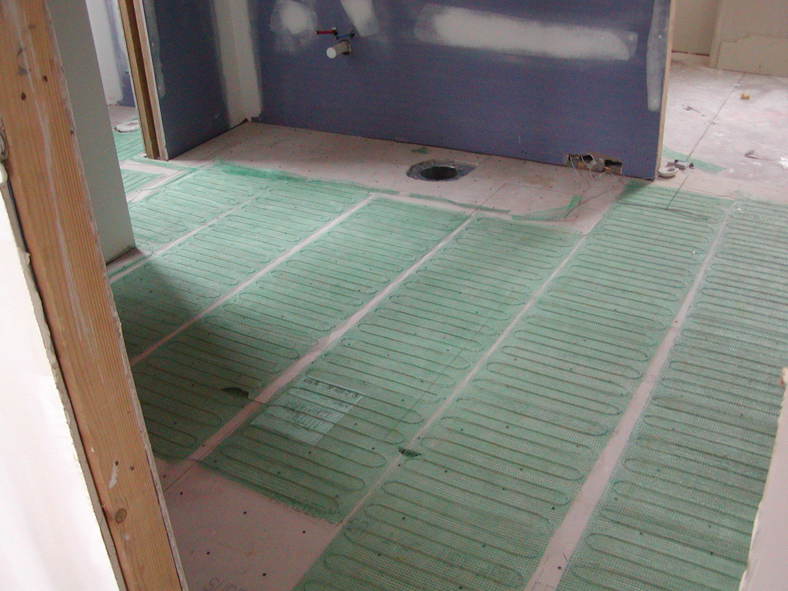 March 28, 2008 -- A heating element has been placed on the floor. It will be covered with concrete and then floor tile. A thermostat will regulate the floor temperature. | ![]() |