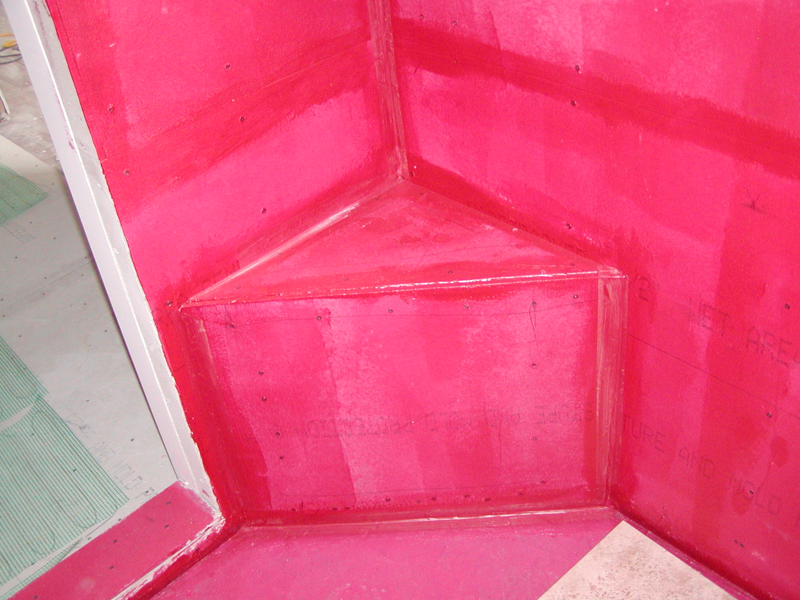 March 28, 2008 -- The shower now has a seat in it. The seat and walls will be covered with tile. The red coating is waterproofing that goes on before the tile. | ![]() |