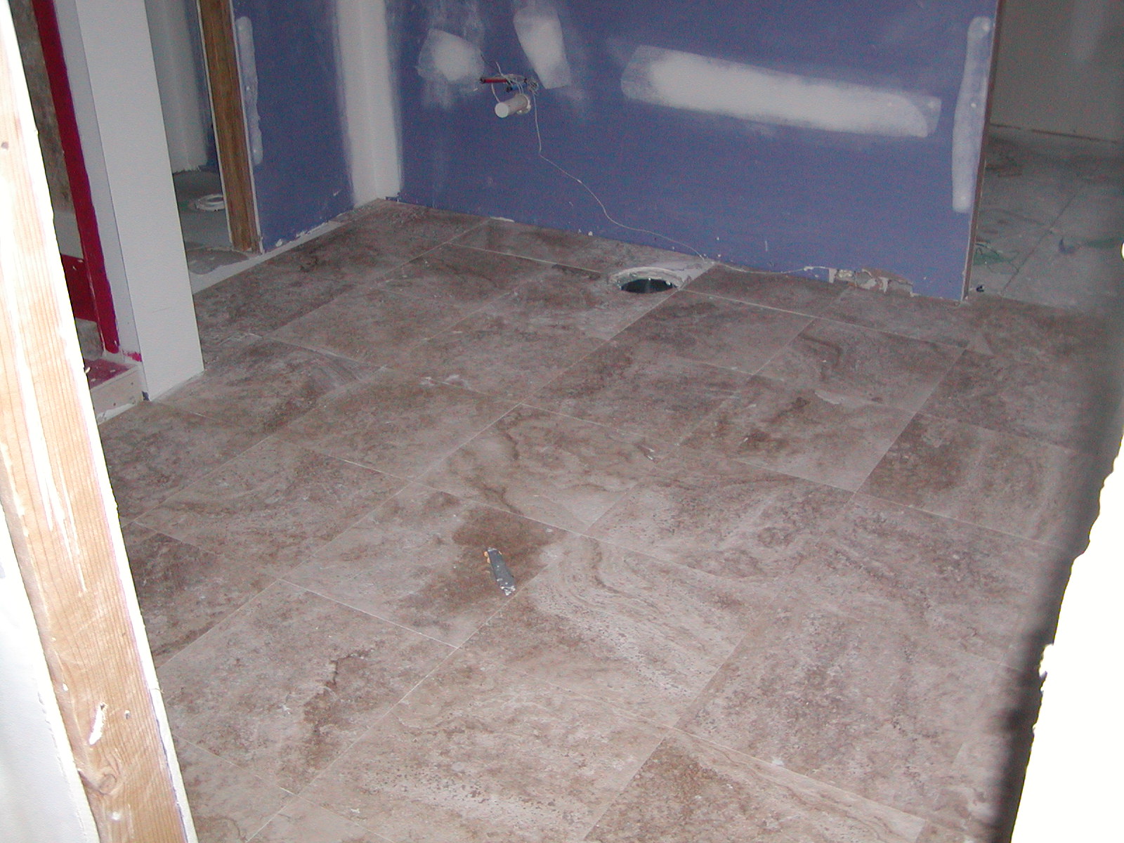 March 31, 2008 -- Tile has been installed on the master bathroom floor. The closet on the far right will have carpet. The round opening will feed baseboard vents in a cabinet that will be in stalled on the far wall. |