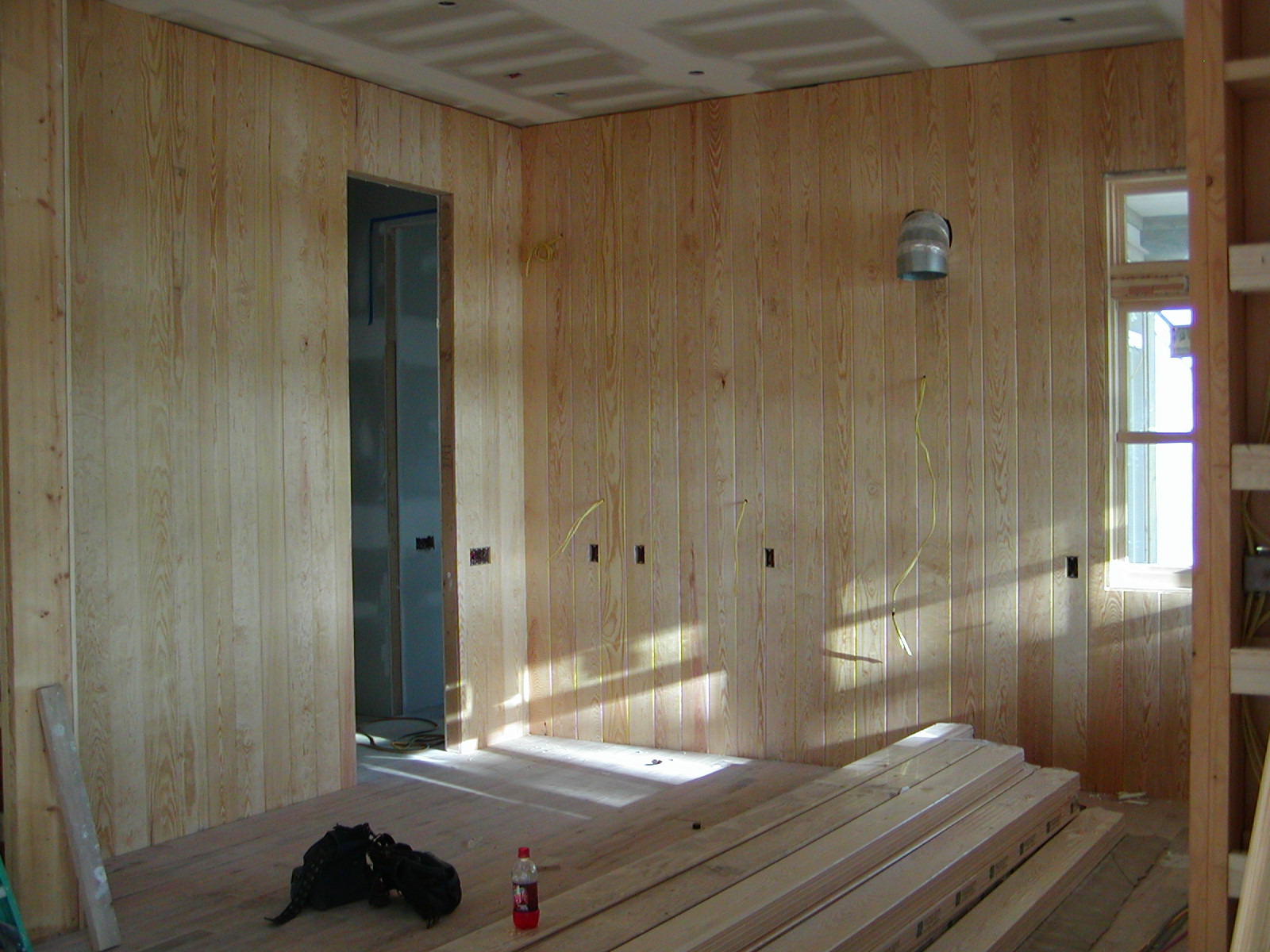 April 2, 2008 -- The kitchen walls now have wood on them. The pipe is a duct for the range blower. | ![]() |