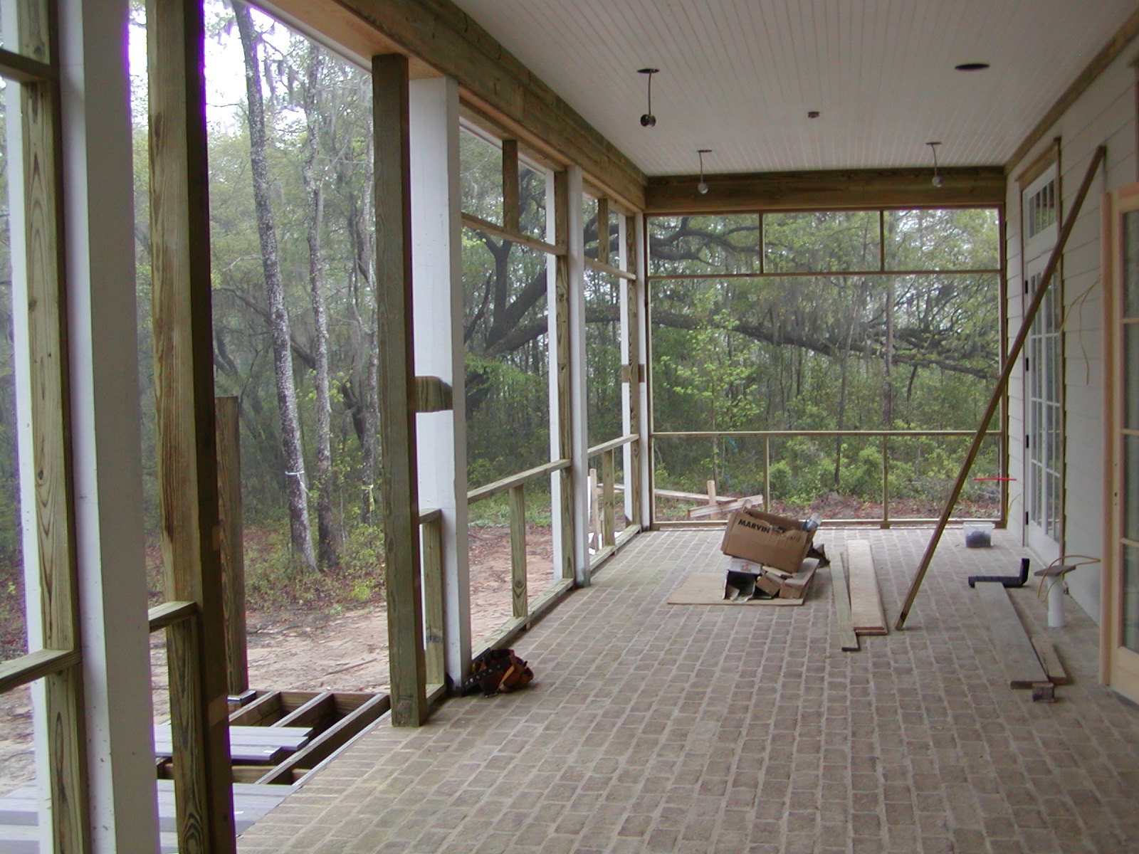 April 4, 2008 -- From the porch the framing is much more visible. To the left between the smaller posts, there will be double screen doors. | ![]() |