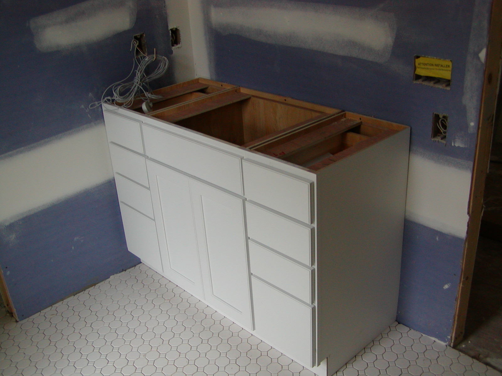 April 8, 2008 -- The guest bathroom cabinets are installed. The wiring on the left side is for the under floor heat. The purple wall board is water resistant. | ![]() |