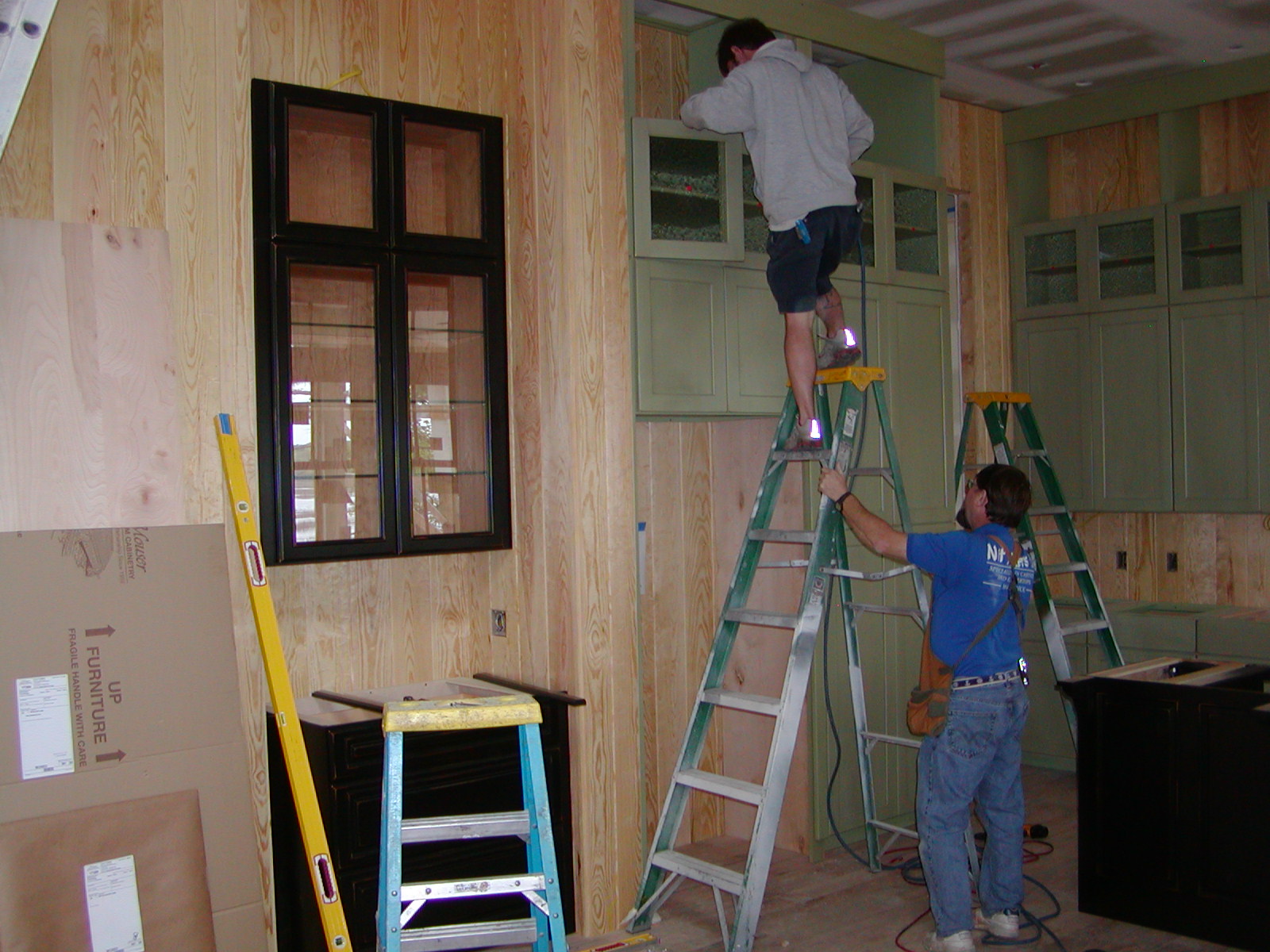 April 8, 2008 -- Kitchen cabinets are being finished up today. The kitchen island is on the right edge of the photo. Templating for counter tops will be done Thursday. | ![]() |