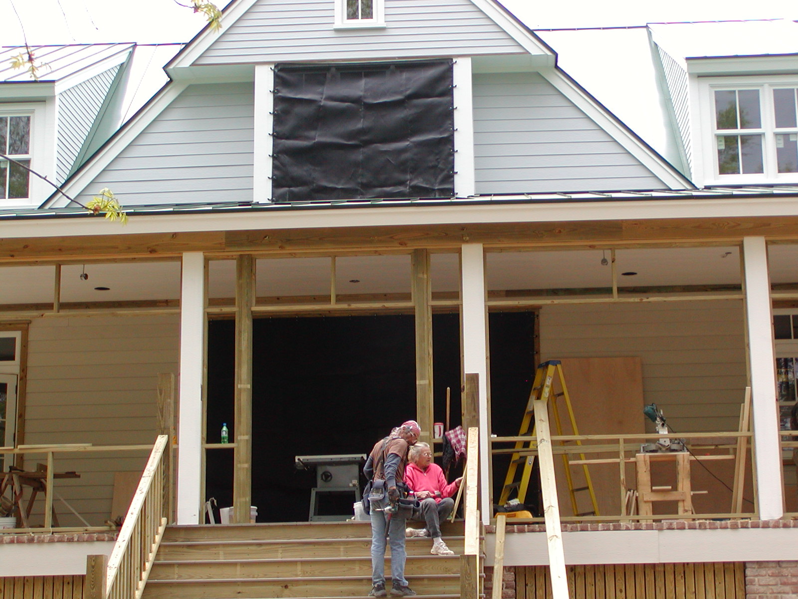 April 14, 2008 -- Hurricane cloth is installed over the large windows. The smaller windows are impact resistant so they don't need additional protection. | ![]() |
