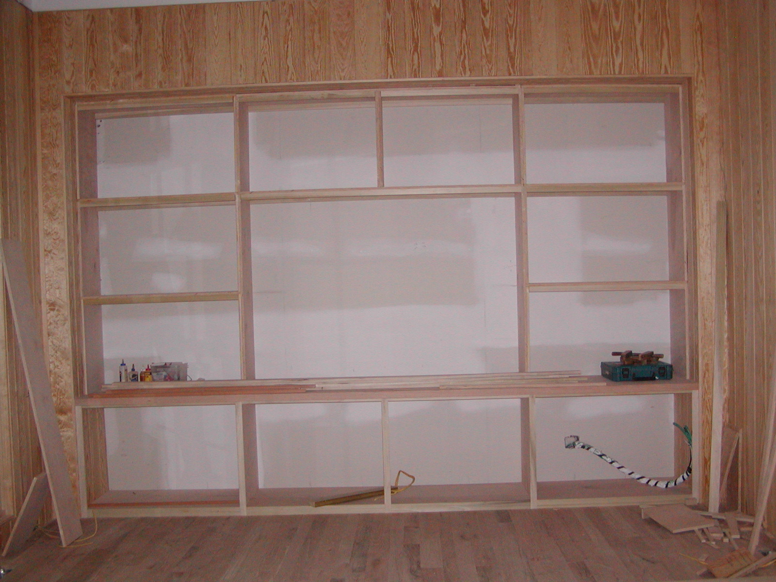 April 15, 2008 -- The living room cabinet is nearly finished. It is on the south wall of the living room.The wide angle lense makes the boards appear curved, but they are straight. | ![]() |