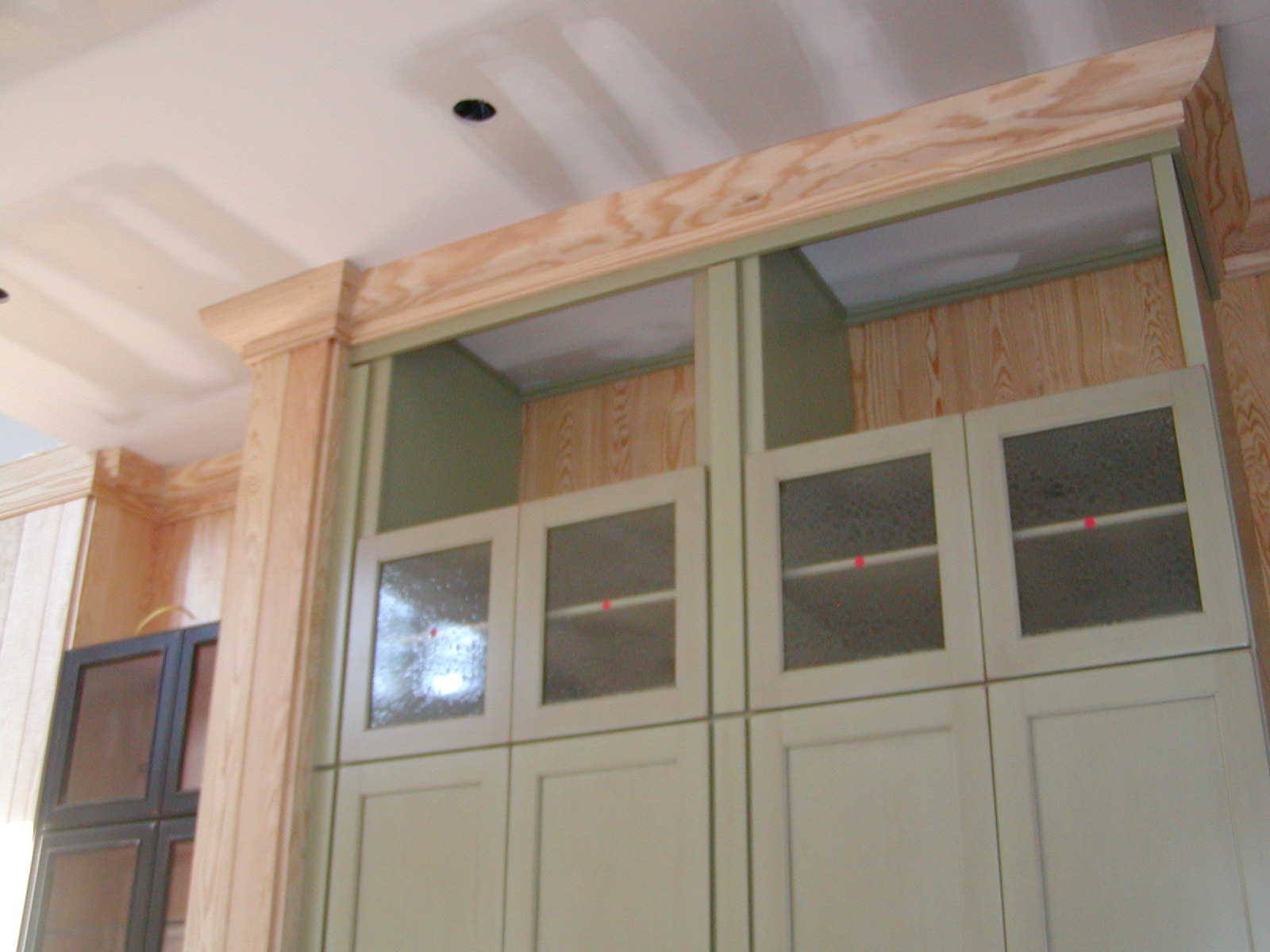April 21, 2008 -- Crown moulding goes around the top cabinets. The crown moulding ends over the dry bar cabinet as can be seen. | ![]() |
