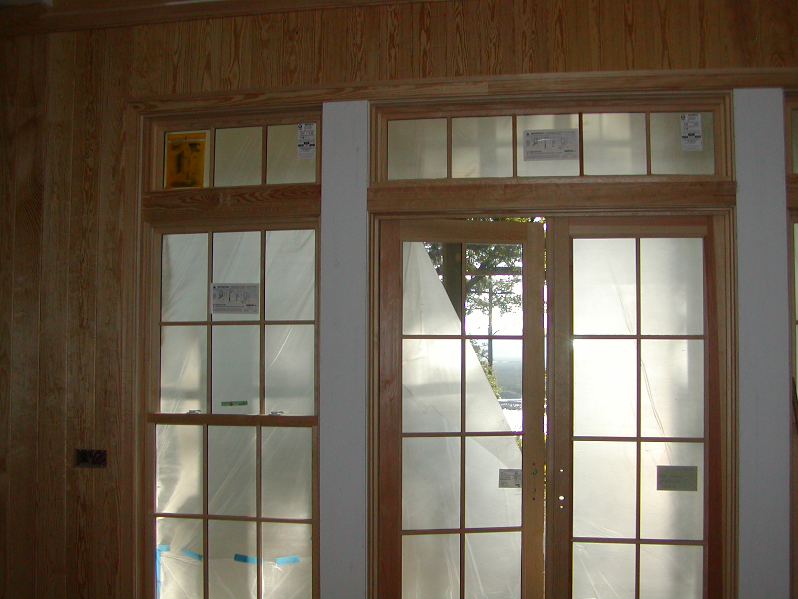 April 22, 2008 -- The front (river side) door assembly now has casing on it. The interior trim will be painted. The white boards are primed trim material. | ![]() |