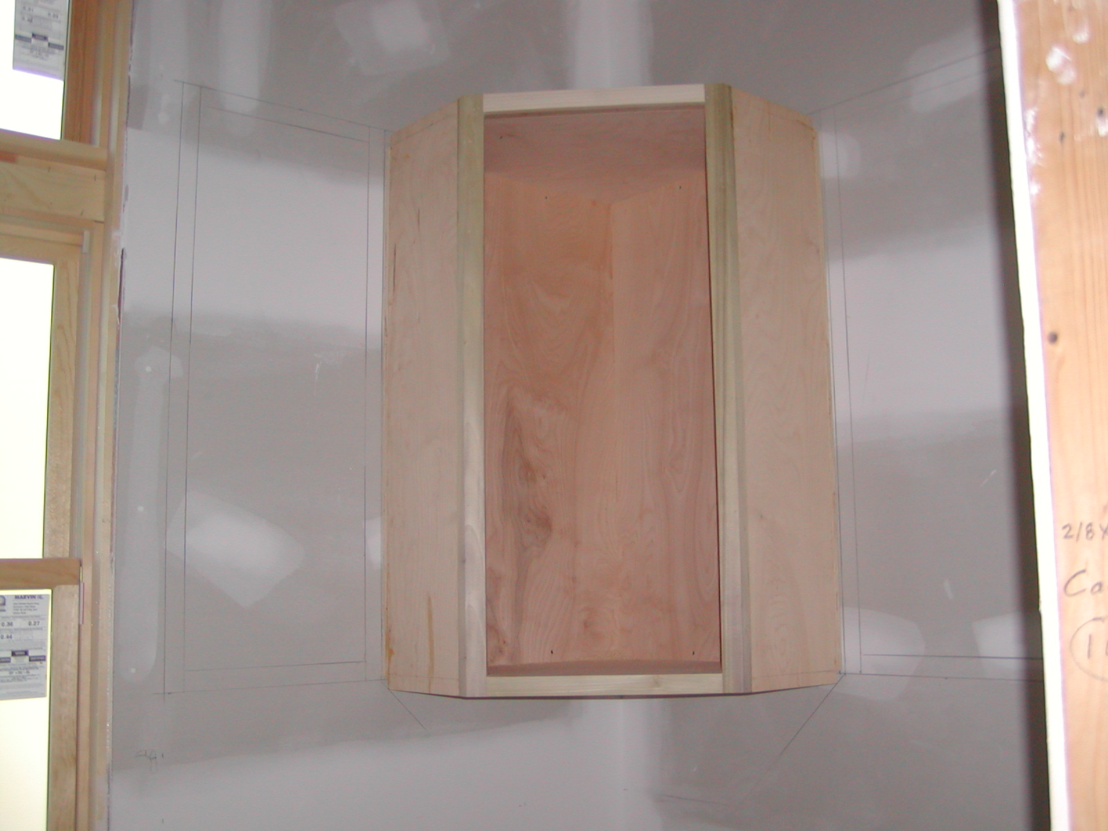 April 22, 2008 -- Pantry room cabinets are being built. This is a corner cabinet that will have adjustable shelves. Markings on the wall illustrate where other cabinets will be installed. | ![]() |