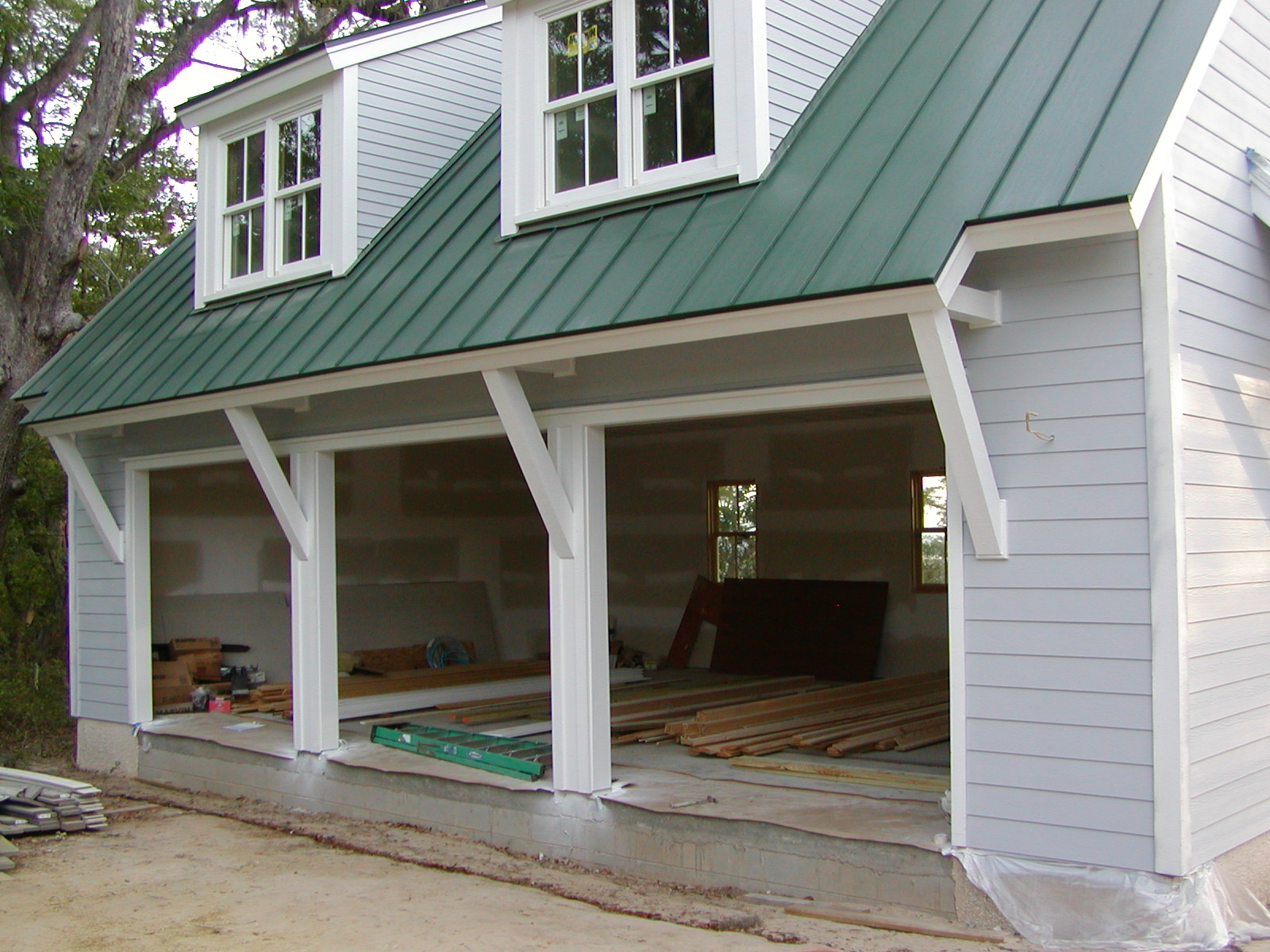 April 25, 2008 -- The garage braces are finished. All of the exterior wood is primed. The siding now is gray (the final color). | ![]() |