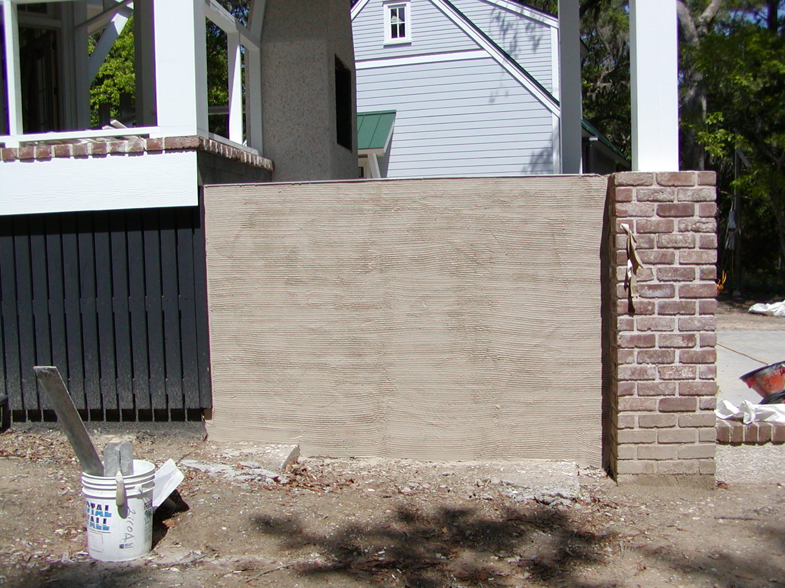 April 29, 2008 -- The outdoor kitchen walls are getting tabby stucco. The scratch coat is on now. This afternoon, it will be finished. | ![]() |