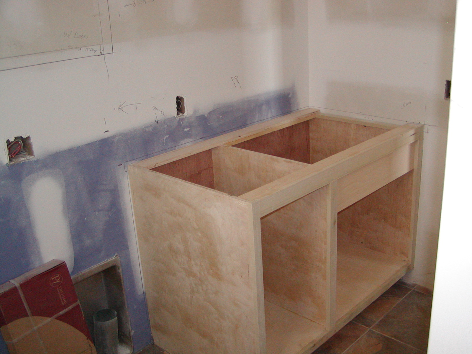 April 29, 2008 -- The laundry room base cabinet has been built. A sink will be installed in the right section. | ![]() |