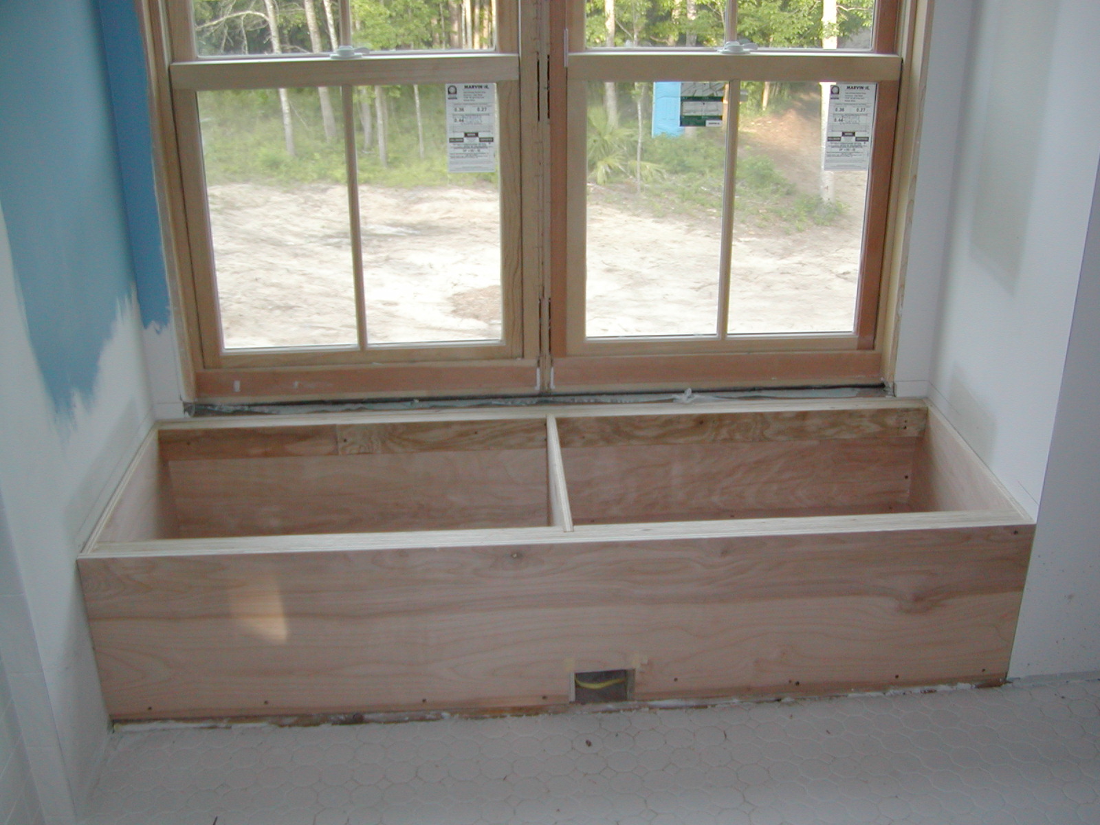 May 2, 2008 -- A window seat for the guest bath is being built. The top will have two hinged parts so each compartment can be opened. The hole on the front is for an outlet. | ![]() |