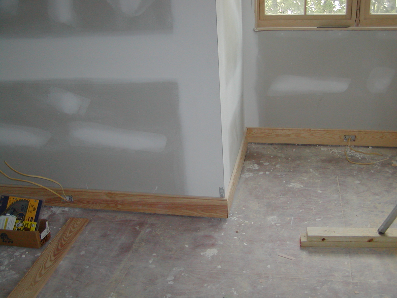 May 2, 2008 -- Interior trim work continues upstairs. Baseboard is being run in the south bedroom. Note the windows have not been trimmed yet. Interior trim should be done in a few days. | ![]() |