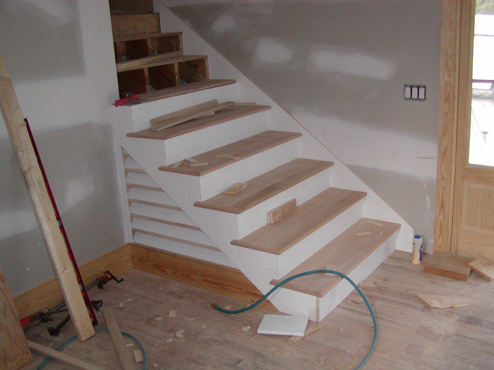 May 8, 2008 -- The inside stairs are being built. The first few stairs are in place. There will be a short railing with a Newell post on the close side. | ![]() |