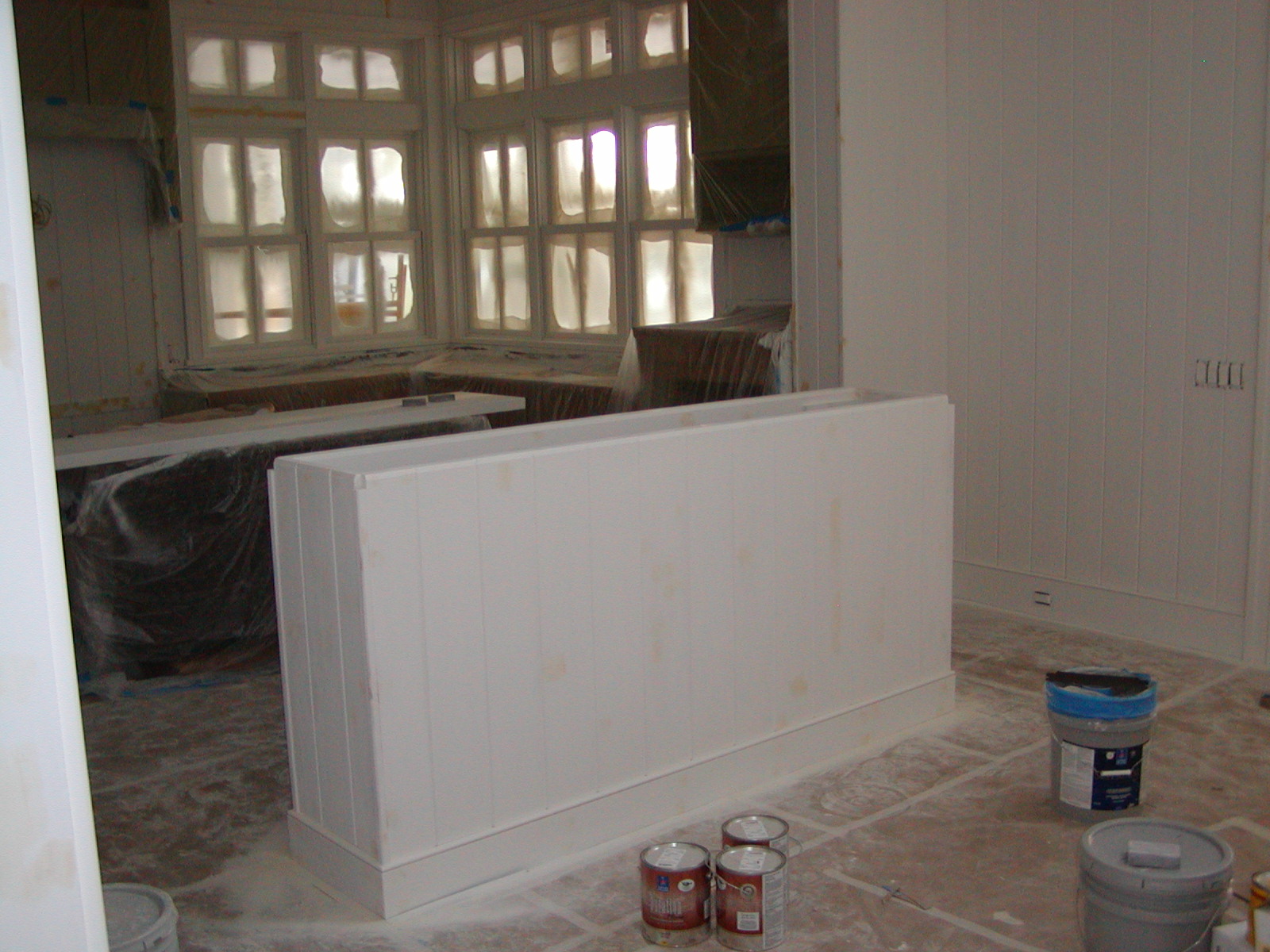 May 23, 2008 -- This half wall has been affixed to the floor and primed. It will house a flat screen television on a lift.The top for the television compartment is on the kitchen island in the background. |