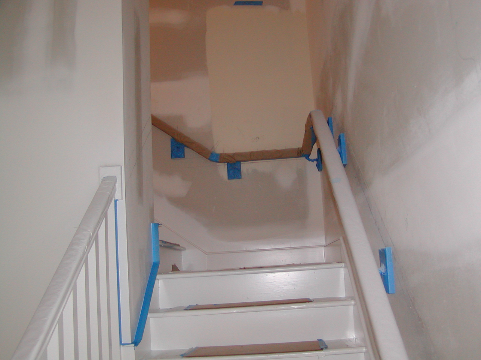 May 29, 2008 -- The handrail will be continuous from the first floor to the second floor. It is masked for spraying. Note the shiny risers on the front of the steps. | ![]() |