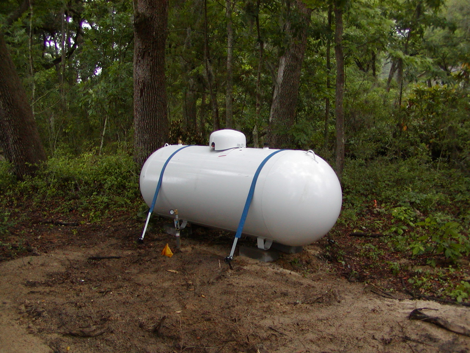 May 29, 2008 -- The 500 gallon propane tank and 400 gallons of propane (not shown in this photo) are in place. The tiedown straps will keep the tank stationary in case of flooding. | ![]() |